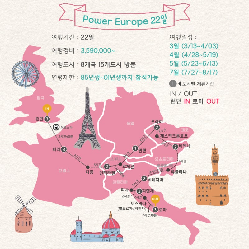 유럽여행이 처음이라면 서유럽에 초점을 맞춘 코스를 추천한다. 유럽 3대 도시인 런던, 파리, 로마와 동유럽 대표 도시인 프라하, 비엔나를 포함하는 여행 일정이라면 유럽의 가장 유명한 도시를 한 번에 여행할 수 있습니다. 3주 서유럽 여행 패키지 코스